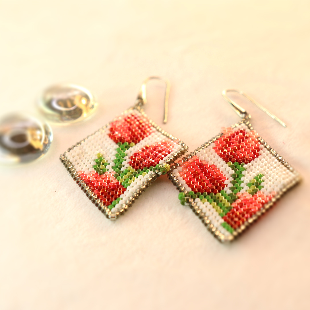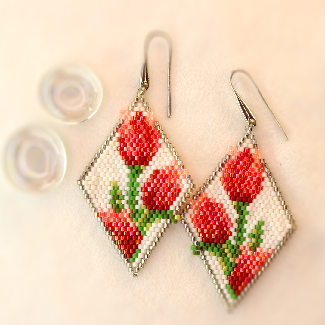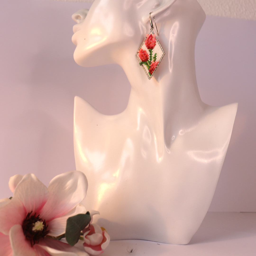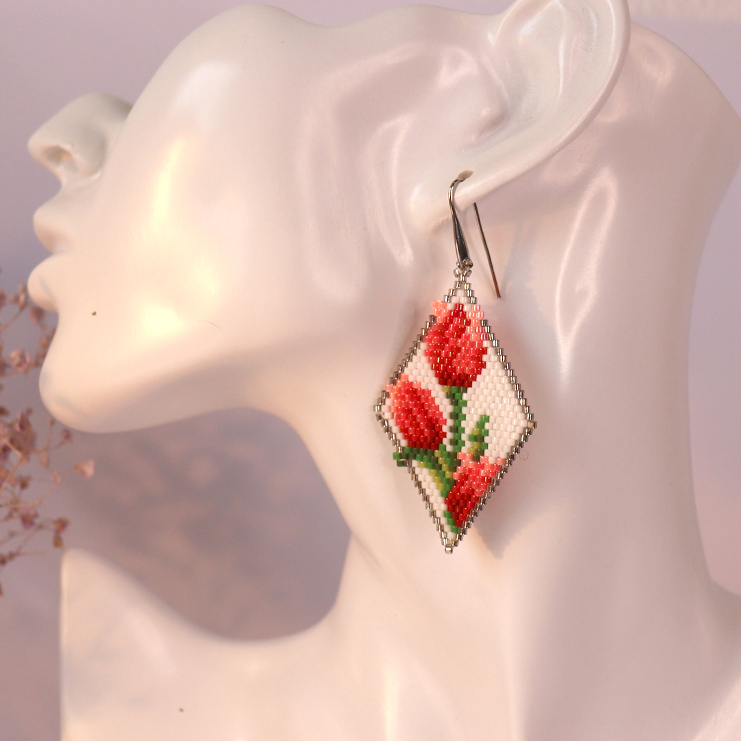 Ik presenteer de luxe oorbellen van hoogwaardige kralen. Charisma, elegantie en verfijning komen tot leven in mijn serie rombvormige oorbellen met een betoverende bloemenprint.